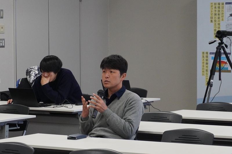和田研究室の三浦さんは、ワカサギの137Cs濃度変動について発表しました。横川ダム貯水池において2017~2025年に採取したワカサギ、湖水、動物プランクトンの137Cs濃度を比較しました。ワカサギおよび湖水の137Cs濃度は経年的に低下していましたが変動も大きく、水位変動や台風の影響が示唆されていました。台風後にはCR(濃度比)が一時的に高い値を示し、各要素間には相関がみられるため、湖水の変動がプランクトンを介してワカサギに影響している可能性があると述べました。