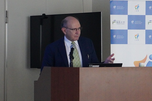本セミナーは、IAEAと福島県との協定に基づいてIAEAの専門家が県内大学等で行う一連の講義のひとつとして、IERで行われました。当日は講義に先立って、福島県環境創造センターの郡司所長、外務省国際原子力協力室の田中室長からご挨拶がありました。