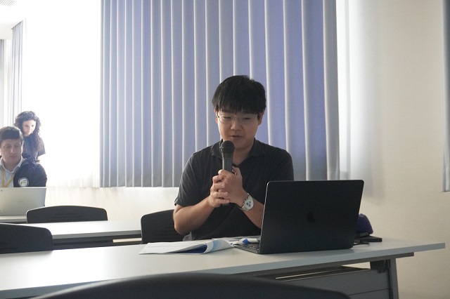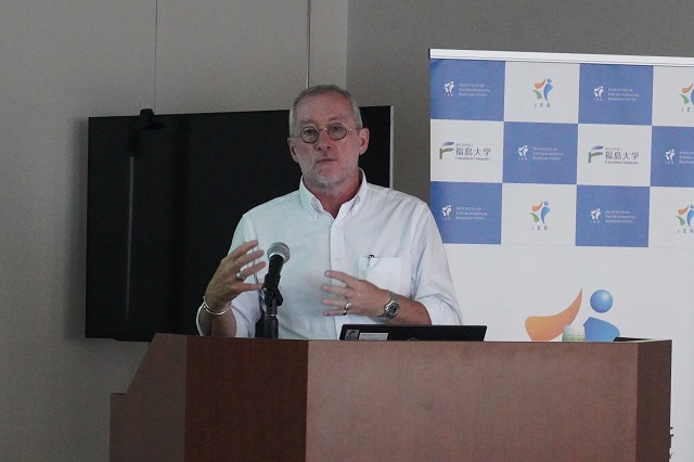 まず、ピナック氏から福島県とIAEAとの協力についての概要が紹介されました。IAEAは福島第一原発の事故後、福島県との協力関係のもと、除染や除去土壌の管理、作業者の安全管理、住民の健康などについての施策に関して、技術的支援、助言等を行ってきたことが述べられました。また、IAEAによる県内大学等での講義は昨年から始まっており、福島大学でも逐次通訳付きで実施されたこと、2025年夏も複数大学等での講義が予定されていること、本日7月7日のIERでの講義がこの夏の最初であることも言及されました。IERでの講義は、大学院での講義も通常英語で行われることから、通訳なしの英語で行われました。